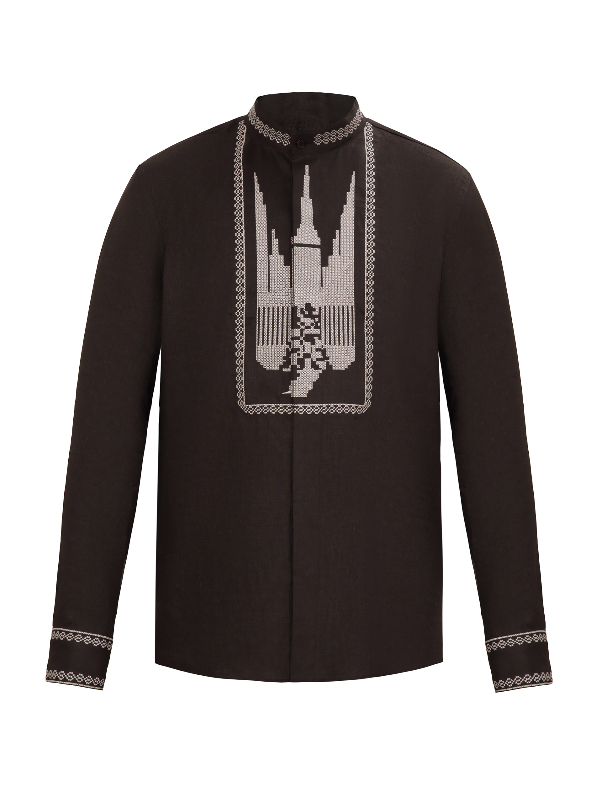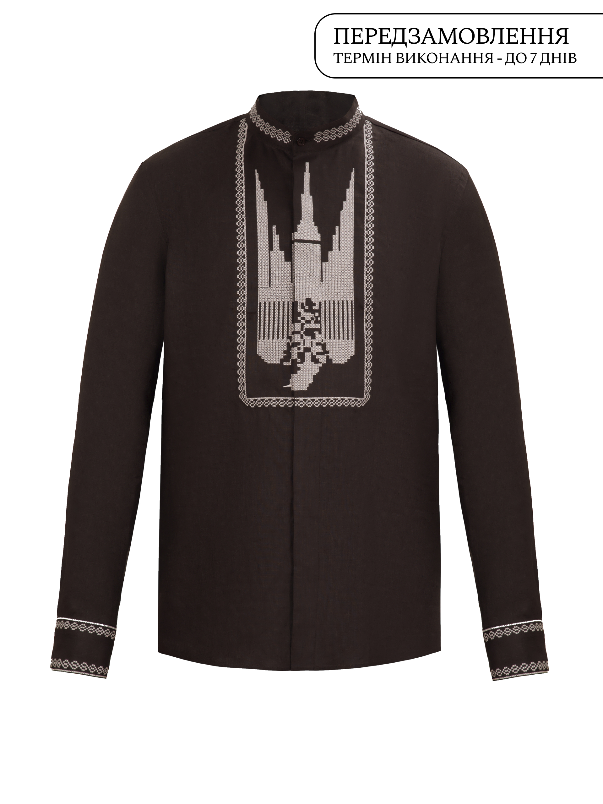 Сорочка прямого крою. Машинна вишивка. Колір – темно-коричневий. Склад – 100% льон. Має довгі рукава з вишитими манжетами і застібками на 1 ґудзик. Класичний комір-стійка із вишивкою.