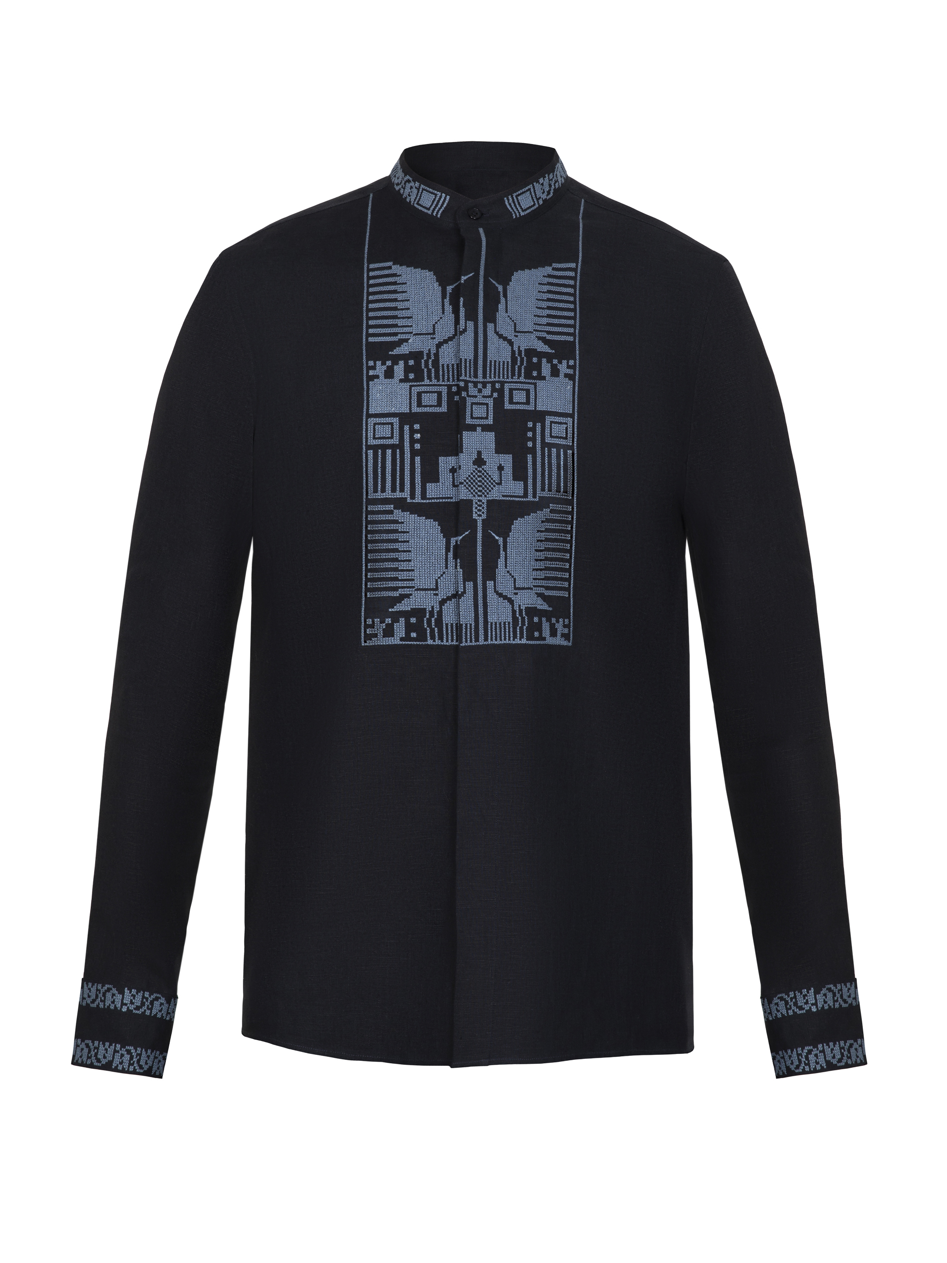 Авторський принт виконаний у техніці “хрестик” блакитними нитками. Сорочка синього кольору прямого крою. Машинна вишивка. Склад – 100% льон. Має довгі рукава з вишитими манжетами і застібками на 1 ґудзик. Класичний комір-стійка з вишивкою.